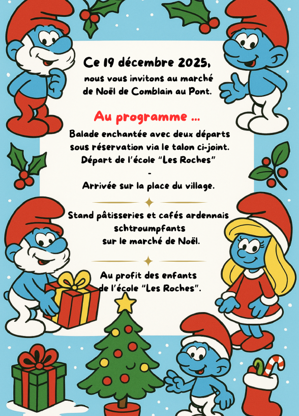 Retrouvez notre stand Schtroumpf au Marché de Noël de Comblain le 19 décembre Posted on 17 décembre 202517 décembre 2025 by lesroches C’est l’occasion de passer un moment sympa ensemble, dans une ambiance conviviale, et de soutenir nos projets : tous les bénéfices iront aux élèves. On vous y attend nombreux !